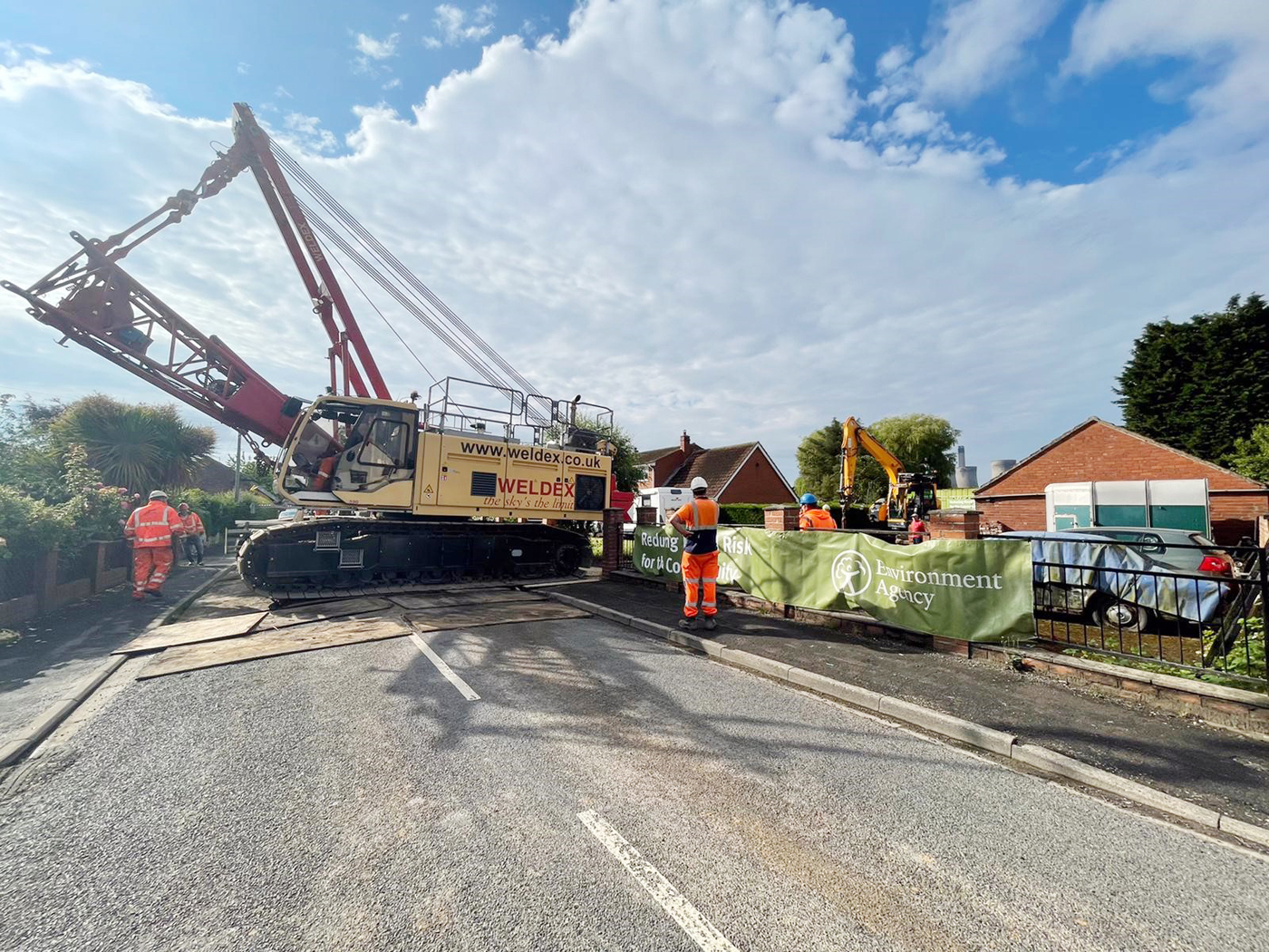 A crane arrives at Chapel Haddlesey to strengthen the flood bank with sheet piling. (15-07-45 SU)