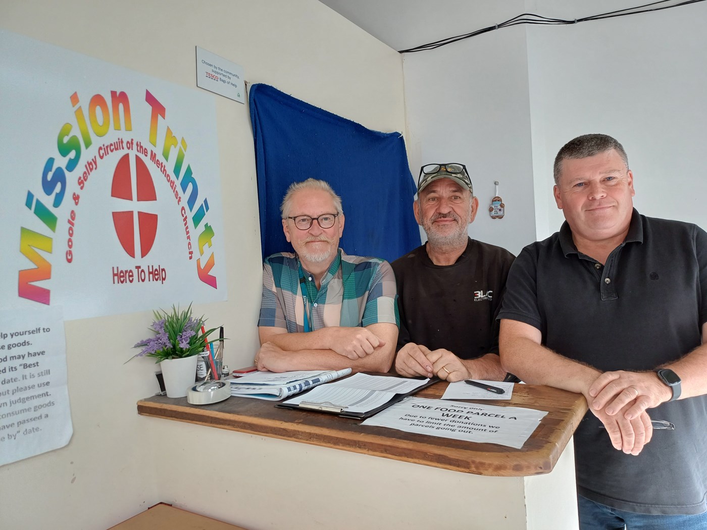 Dave Sample from Mission Trinity Foodbank, Ian Sherriff Chair of The Garlthorpe Charity, and Andy Baker the Food collection Co-Ordinator for Barmby, Asselby and Howden. (05-09-045 SU)