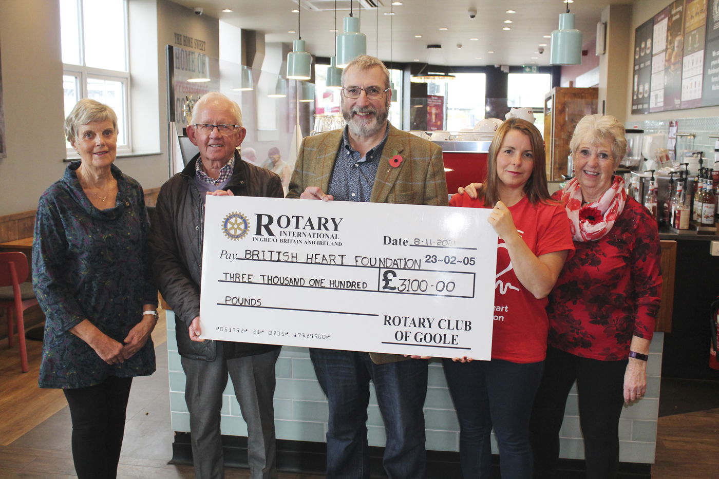 The Rotary Club of Goole presented the British Heart Foundation with a cheque for £3100. Pictured are (l-r): Cynthia Underwood, Club Secretary Graham Hawksworth, Club President John Sweetman, British Heart Foundation Fundraising Manager Jodie Shepherd, and Rona Dickinson. (18-11-300 SU)